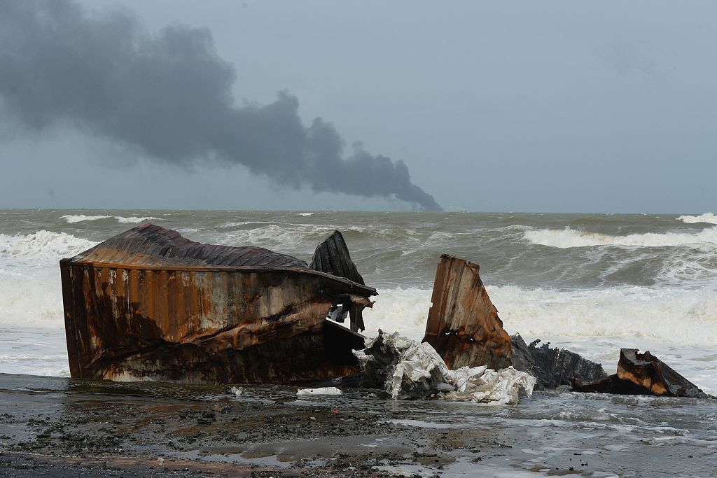 当地时间2021年5月25日,斯里兰卡科伦坡,斯里兰卡海军发言人表示,日前因发生火灾停泊在斯里兰卡科伦坡港附近的集装箱船当天发生爆炸,并再次起火,船上全部25名船员已安全撤离,其中2人被送往医院。图片来源:人民视觉