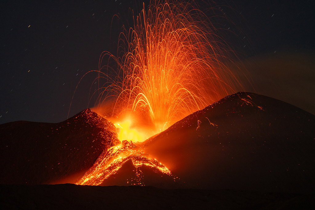 当地时间2021年5月25日,意大利西西里岛,卡塔尼亚的埃特纳火山持续喷发,熔岩涌出如同喷泉。图片来源:人民视觉