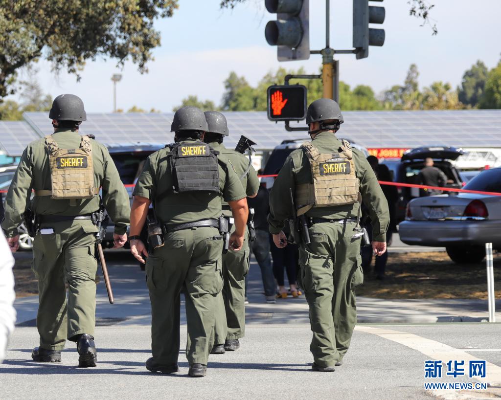 美国警方26日说,加利福尼亚州北部城市圣何塞当天早晨发生的枪击事件造成至少8死1伤,枪手在案发现场自杀身亡。图为5月26日,在美国加利福尼亚州圣何塞,警察在枪击事件现场附近警戒。新华社发(董旭东摄)