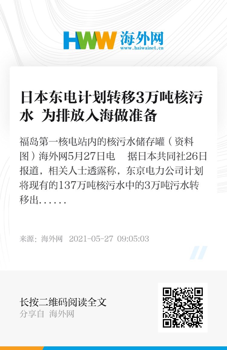 海外网5月27日电 据日本共同社26日报道,相关人士透露称,东京电力公司计划将现有的137万吨核污水中的3万吨污水转移出来,以检测其中的放射性物质含量,为排放入海做准备。