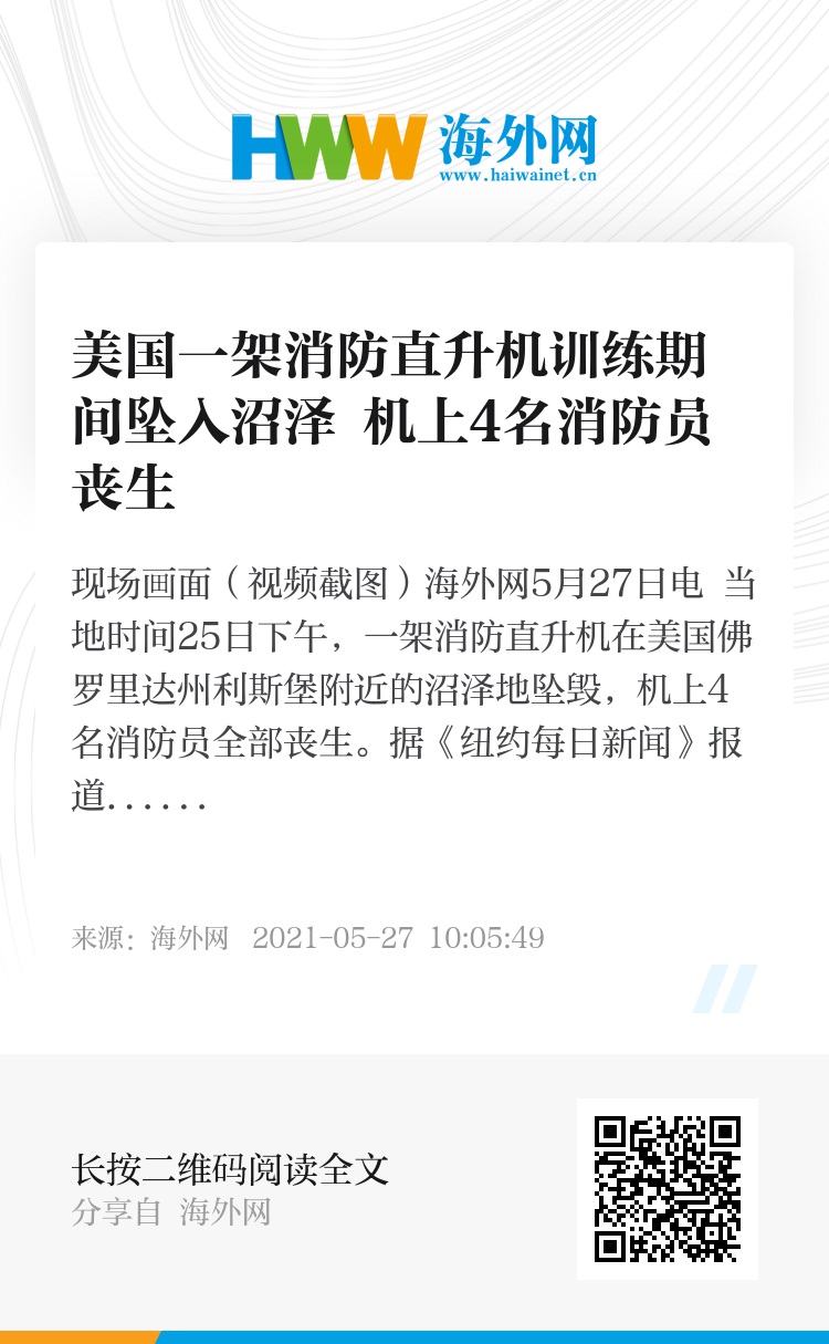 海外网5月27日电 当地时间25日下午,一架消防直升机在美国佛罗里达州利斯堡附近的沼泽地坠毁,机上4名消防员全部丧生。
