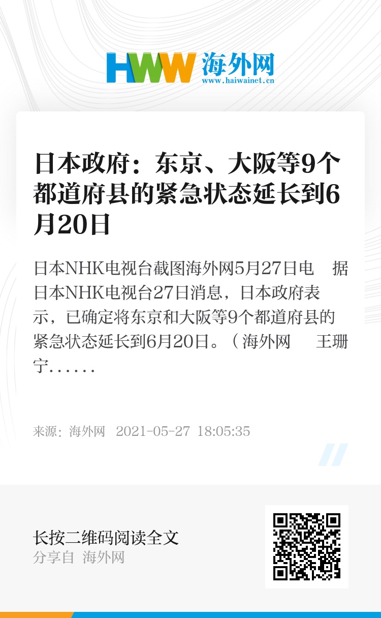海外网5月27日电 据日本NHK电视台27日消息,日本政府表示,已确定将东京和大阪等9个都道府县的紧急状态延长到6月20日。(海外网 王珊宁)