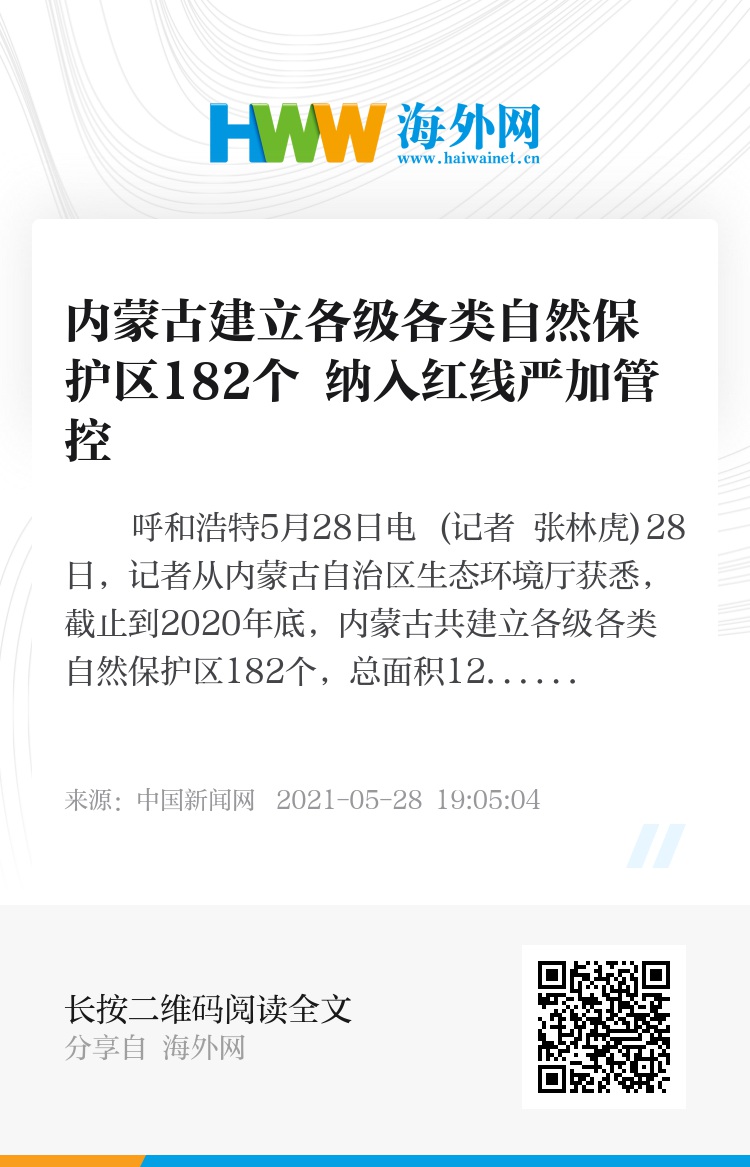 中新网呼和浩特5月28日电 (记者 张林虎)28日,记者从内蒙古自治区生态环境厅获悉,截止到2020年底,内蒙古共建立各级各类自然保护区182个,总面积1267.04万公顷,占全区国土面积的10.71%。