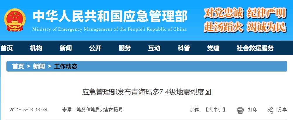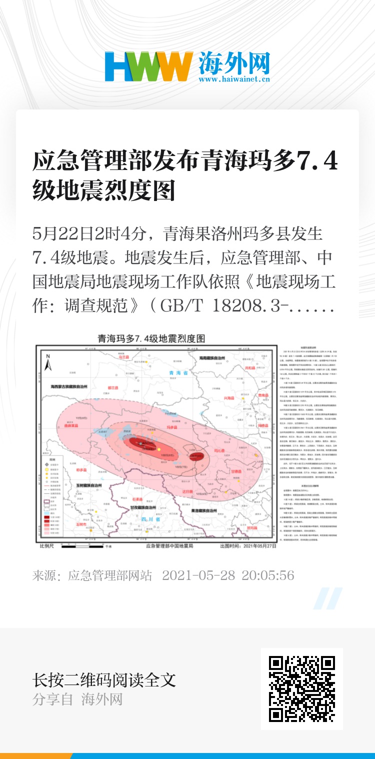 5月22日2时4分,青海果洛州玛多县发生7.4级地震。地震发生后,应急管理部、中国地震局地震现场工作队依照《地震现场工作:调查规范》(GB/T 18208.3-2011)、《中国地震烈度表》(GB/T 17742-2020),对灾区55个调查点展开了实地震害调查,并参考震区断裂构造、余震分布、震源机制、仪器烈度分布等科技支撑成果,结合强震动观测记录,确定了此次地震的烈度分布,完成了《青海玛多7.4级地震烈度图》编制工作,并征求了青海省人民政府和有关州政府、住房和城乡建设部意见,现正式向社会公布。