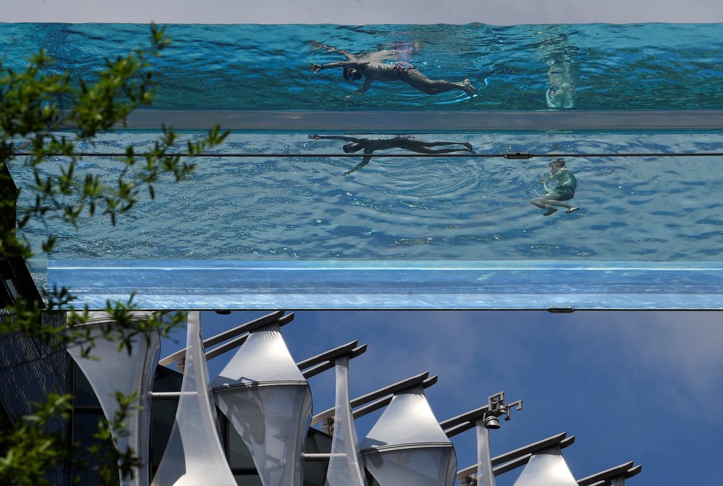 世界首个全透明“空中泳池”开业 民众360度无死角展现泳姿体验独特