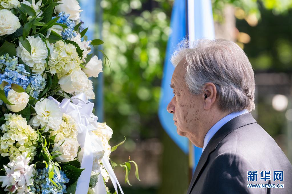 在5月29日联合国维和人员国际日即将到来之际,古特雷斯27日在纽约联合国总部向维和人员纪念碑敬献花圈,缅怀自1948年以来在联合国维和行动中殉职的4000余名维和人员。图为5月27日,在位于纽约的联合国总部,联合国秘书长古特雷斯向维和人员纪念碑敬献花圈。新华社发(联合国供图/马克·加滕摄)