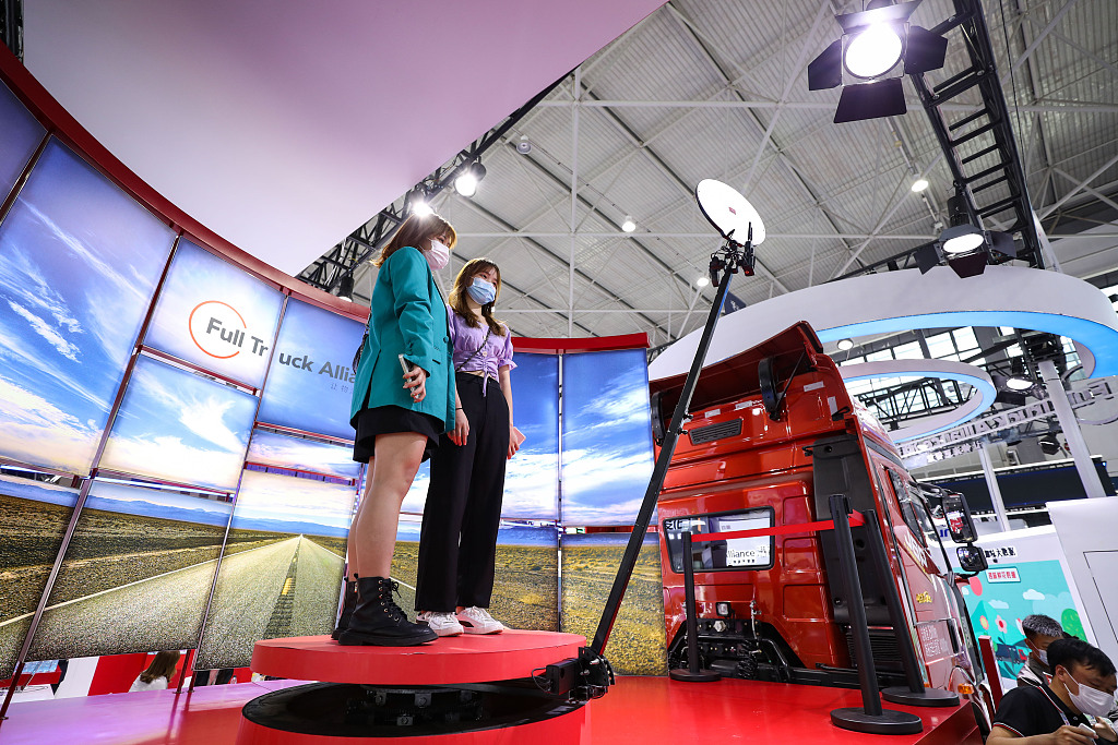 5月27日,贵阳,两位参观者在体验“360全景公路视频拍摄”。中新社记者 瞿宏伦 摄