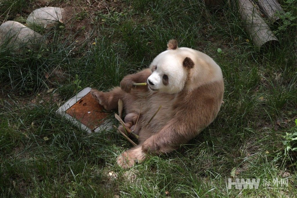 ​5月28日,位于陕西西安周至县的秦岭四宝科学公园试运营,园内全球唯一的圈养棕色大熊猫“七仔”与公众见面。 中新社记者 张远 摄