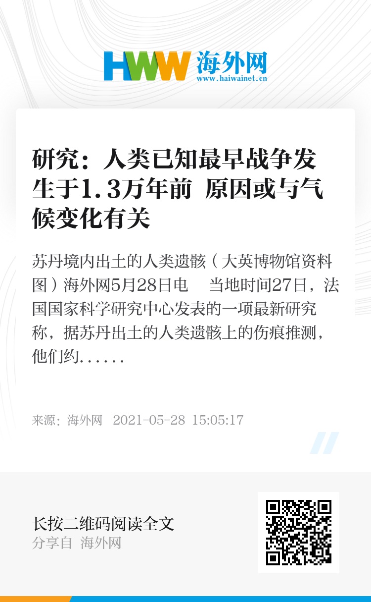 海外网5月28日电 当地时间27日,法国国家科学研究中心发表的一项最新研究称,据苏丹出土的人类遗骸上的伤痕推测,他们约1.3万年前死于一场人类已知的最早战争,而战争的原因可能是急剧的气候变化。