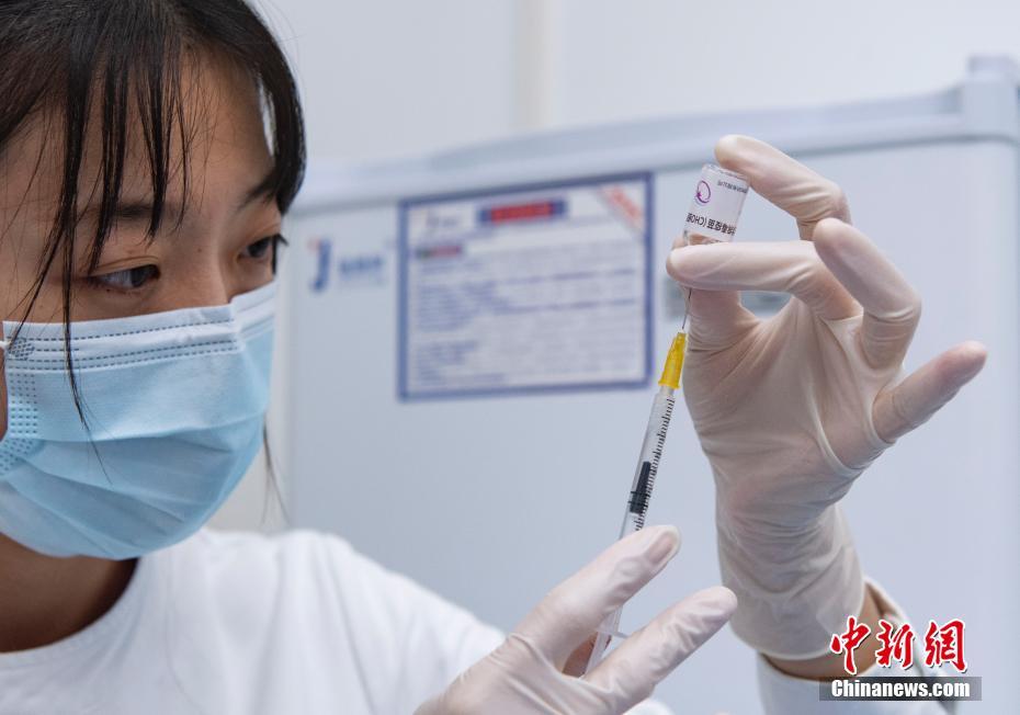 5月28日,北京市海淀区小荷门诊部新冠疫苗接种点内,医护人员正在抽取“三针”剂的重组新型冠状病毒疫苗(CHO细胞),准备为选择该种疫苗的市民接种。中新社记者 侯宇 摄