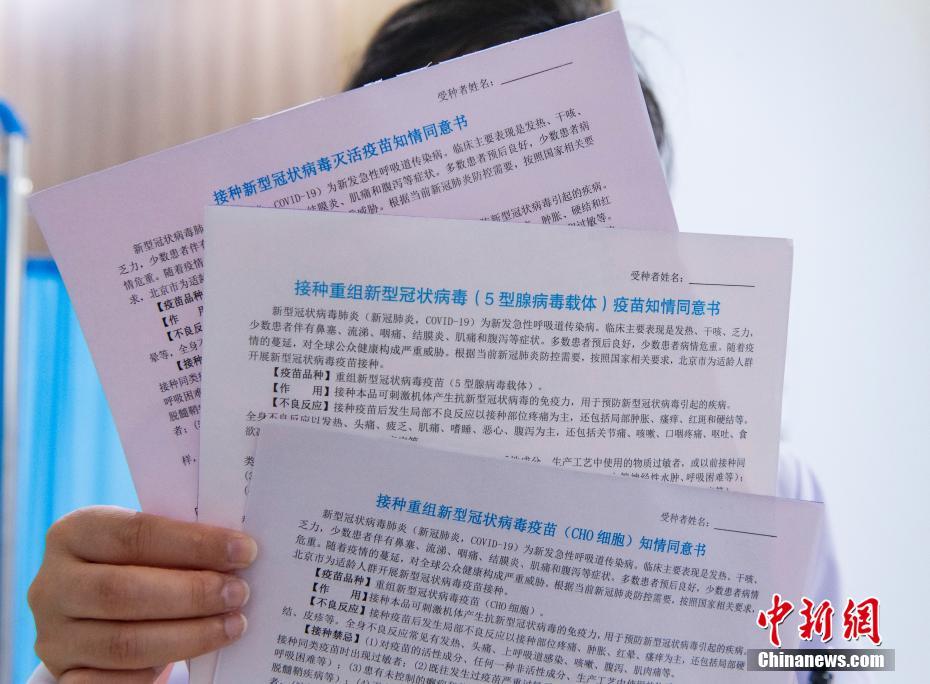 5月28日,北京市海淀区小荷门诊部新冠疫苗接种点内,医护人员展示三种类型新冠疫苗的接种知情同意书。中新社记者 侯宇 摄