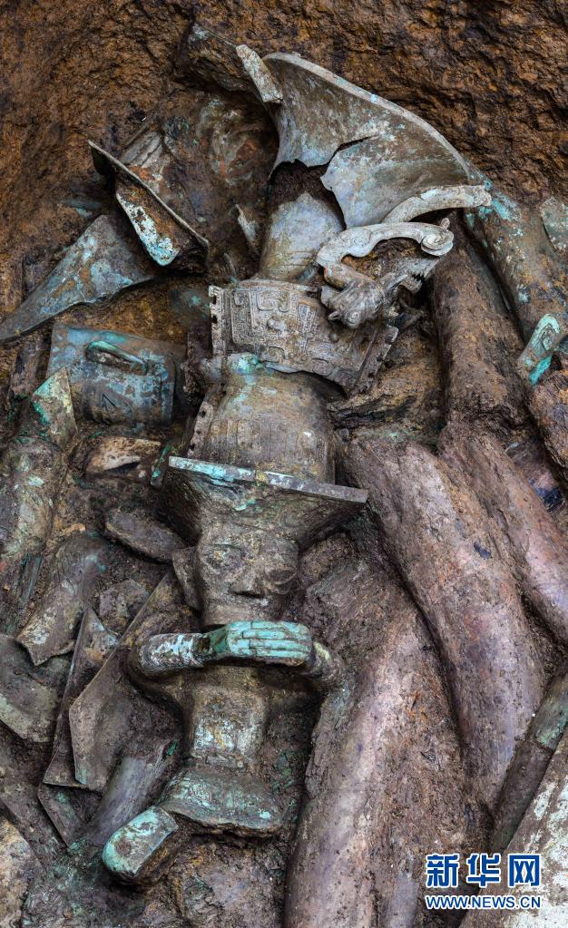 这是在四川德阳广汉市三星堆遗址拍摄的青铜顶尊人像(5月14日摄)。新华社记者 王曦 摄