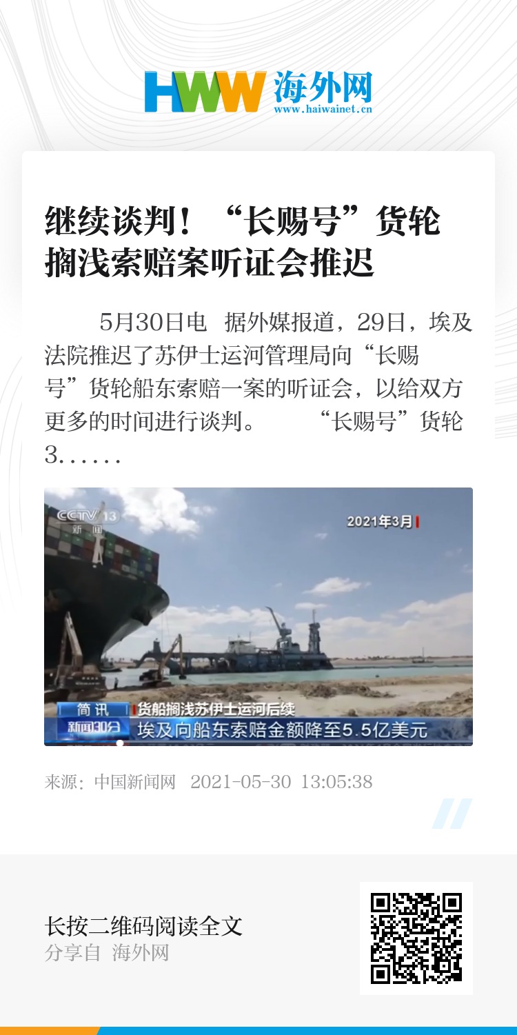 中新网5月30日电 据外媒报道,29日,埃及法院推迟了苏伊士运河管理局向“长赐号”货轮船东索赔一案的听证会,以给双方更多的时间进行谈判。