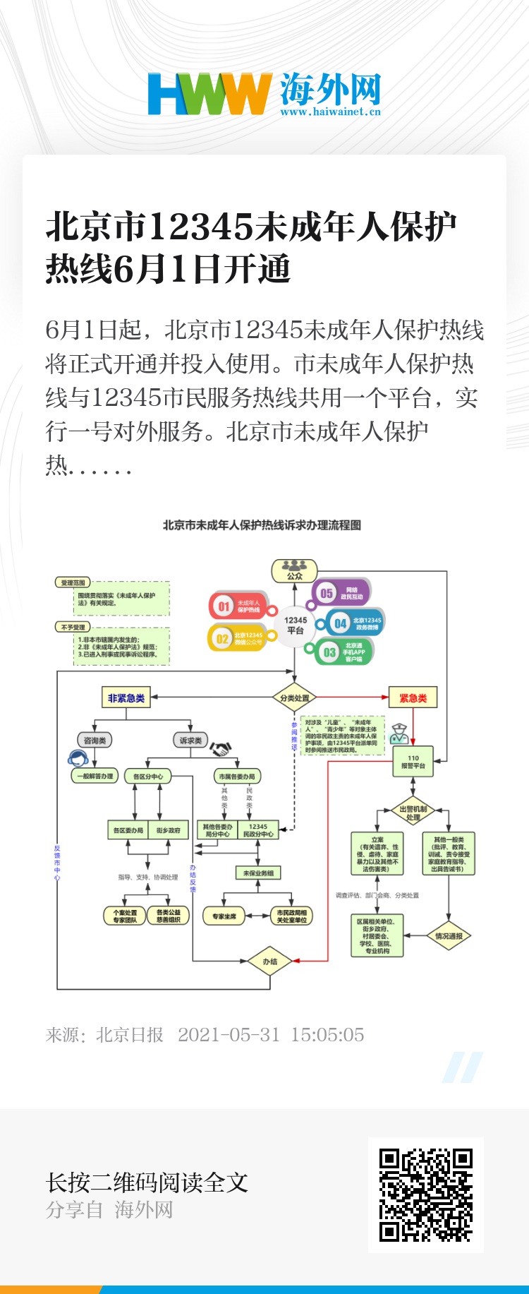 6月1日起,北京市12345未成年人保护热线将正式开通并投入使用。市未成年人保护热线与12345市民服务热线共用一个平台,实行一号对外服务。