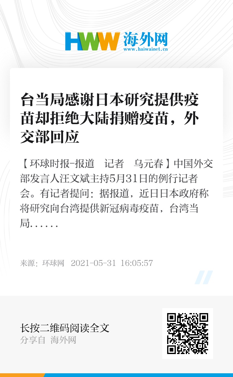 “我注意到日本目前尚无法确保自身疫苗的充足的供给,在此情况下,日本政府宣布将研究向台湾地区提供疫苗,受到外界包括岛内很多媒体和民众的质疑。我想强调,疫苗援助理应回归挽救生命的初衷,而不应沦为图谋政治私利的工具。”