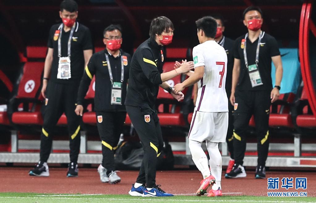 5月30日,中国队球员武磊(前右)在被替换下场后与主教练李铁击掌。当日,在江苏苏州举行的2022年卡塔尔世界杯预选赛亚洲区40强赛中,中国队以7比0战胜关岛队。新华社记者 杨磊 摄