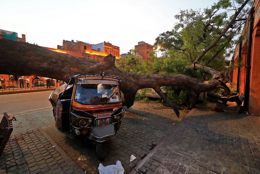 当地时间2021年5月30日,印度拉贾斯坦邦斋浦尔遭遇强风暴袭击,大树被连根拔起,砸毁车辆。图片来源:人民视觉