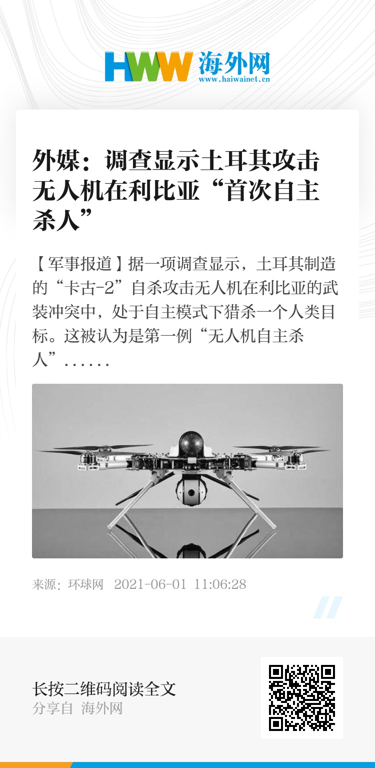 俄罗斯卫星通讯社6月1日援引《新科学家》杂志的报道称,据联合国的一项调查研究,当时这架土耳其无人机是在没有人为命令的情况下将人杀死的。这是有史以来第一例记录在案的“无人机首次自主杀人”。