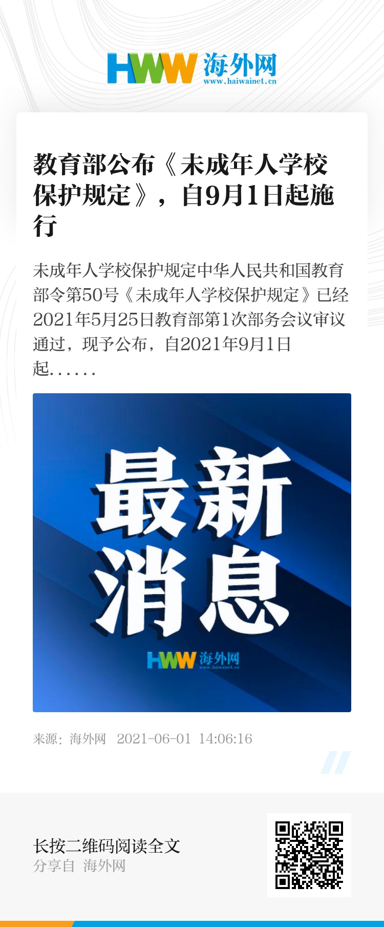 《未成年人学校保护规定》已经2021年5月25日教育部第1次部务会议审议通过,现予公布,自2021年9月1日起施行。