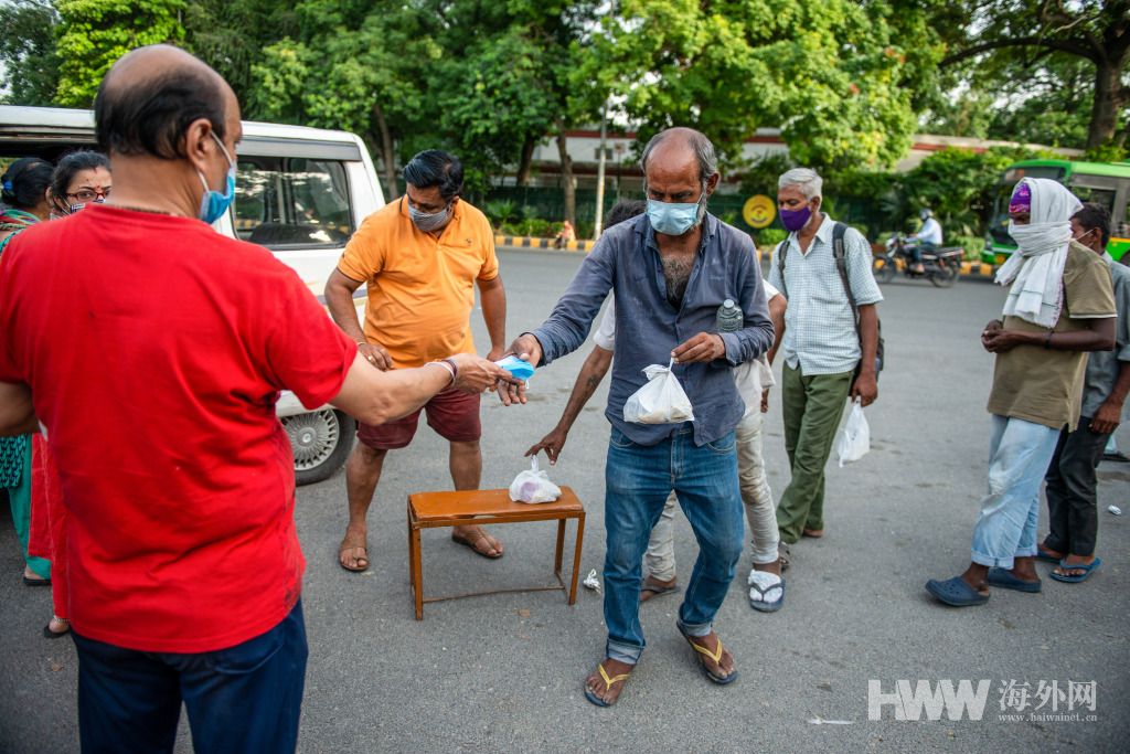 5月31日,印度新德里,印度教信徒向受到新冠疫情影响的民众分发口罩和食品包。(供图:澎湃影像)