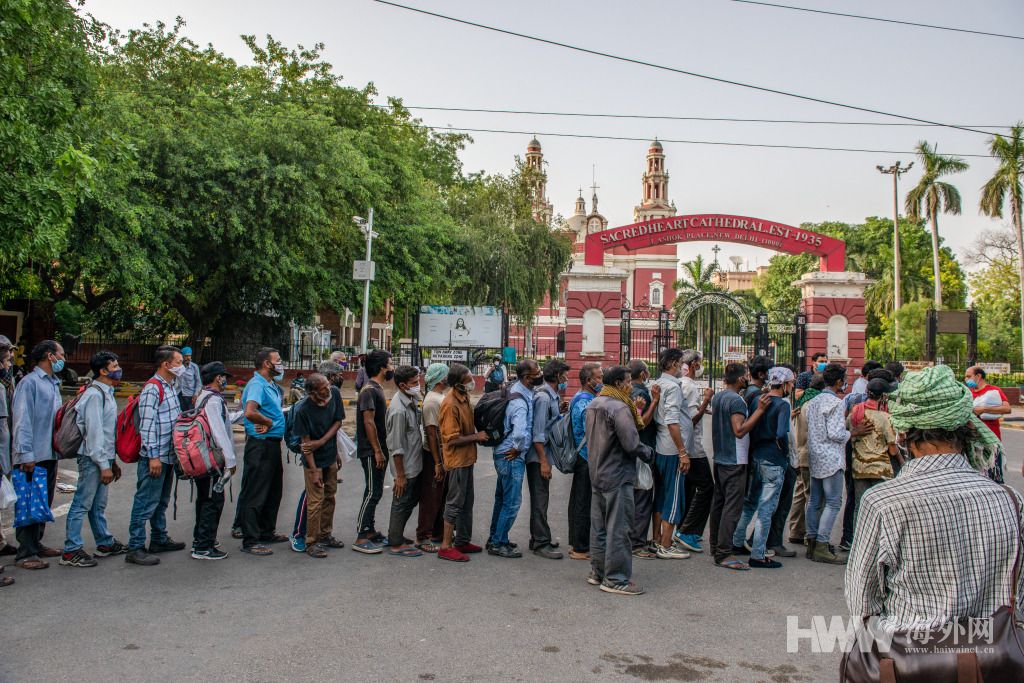 5月31日,印度新德里,印度教信徒向受到新冠疫情影响的民众分发口罩和食品包。(供图:澎湃影像)