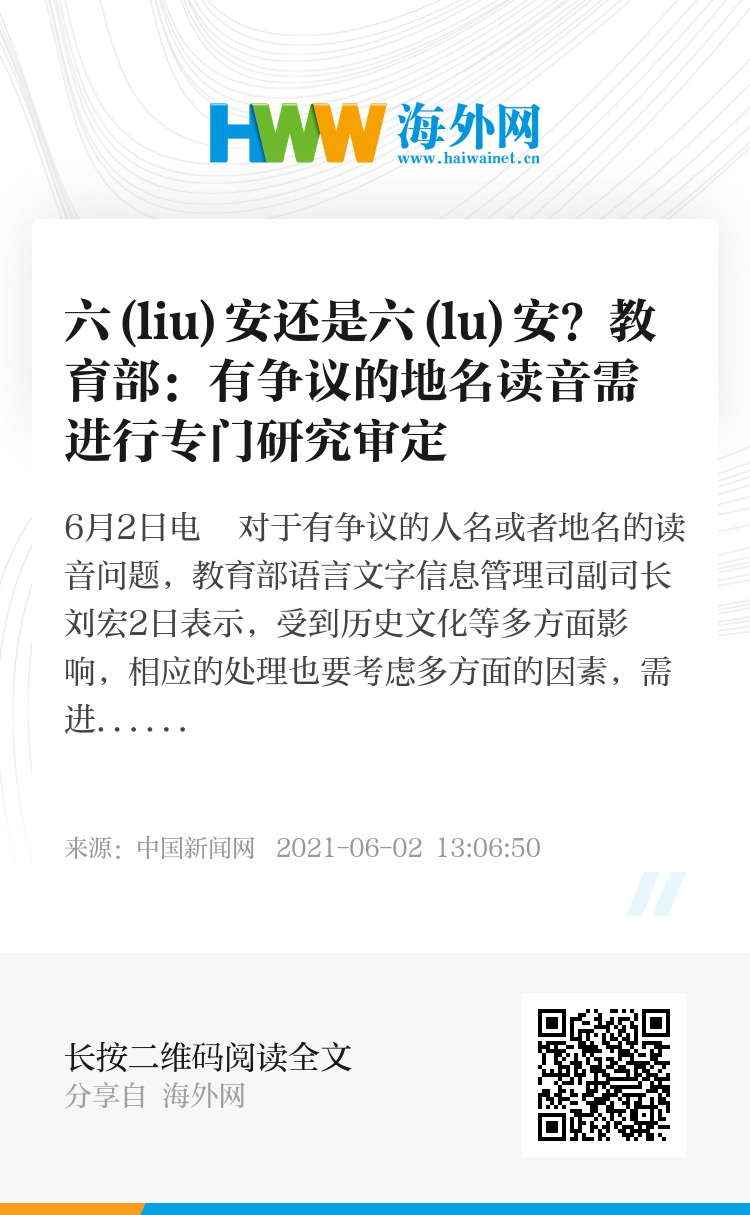 2日,教育部举行新闻发布会。有记者提问:近期安徽六(liu)安亦或六(lu)安的读音引发了热议,想请问一下针对这一类有争议的人名或者地名的读音是否有统一的标准?今后在读音的审定上会做出怎样的调整?