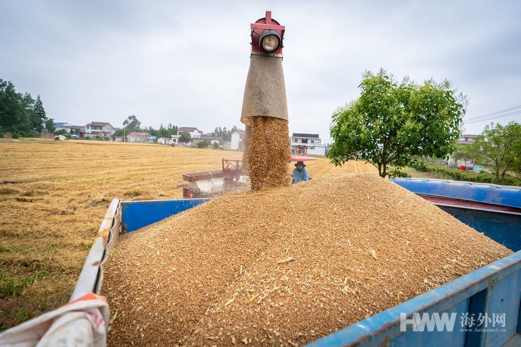 6月2日,江苏扬州,夏收工作正在如火如荼的进行中。农业人员正在将联合收割机里采收的小麦装车。(供图:东方IC)