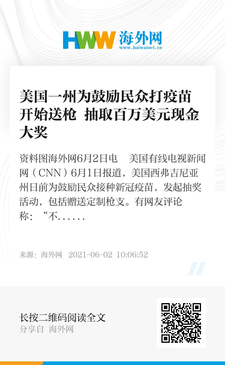 海外网6月2日电 美国有线电视新闻网(CNN)6月1日报道,美国西弗吉尼亚州日前为鼓励民众接种新冠疫苗,发起抽奖活动,包括赠送定制枪支。有网友评论称:“不同意自己纳税的钱用来做这种事”。