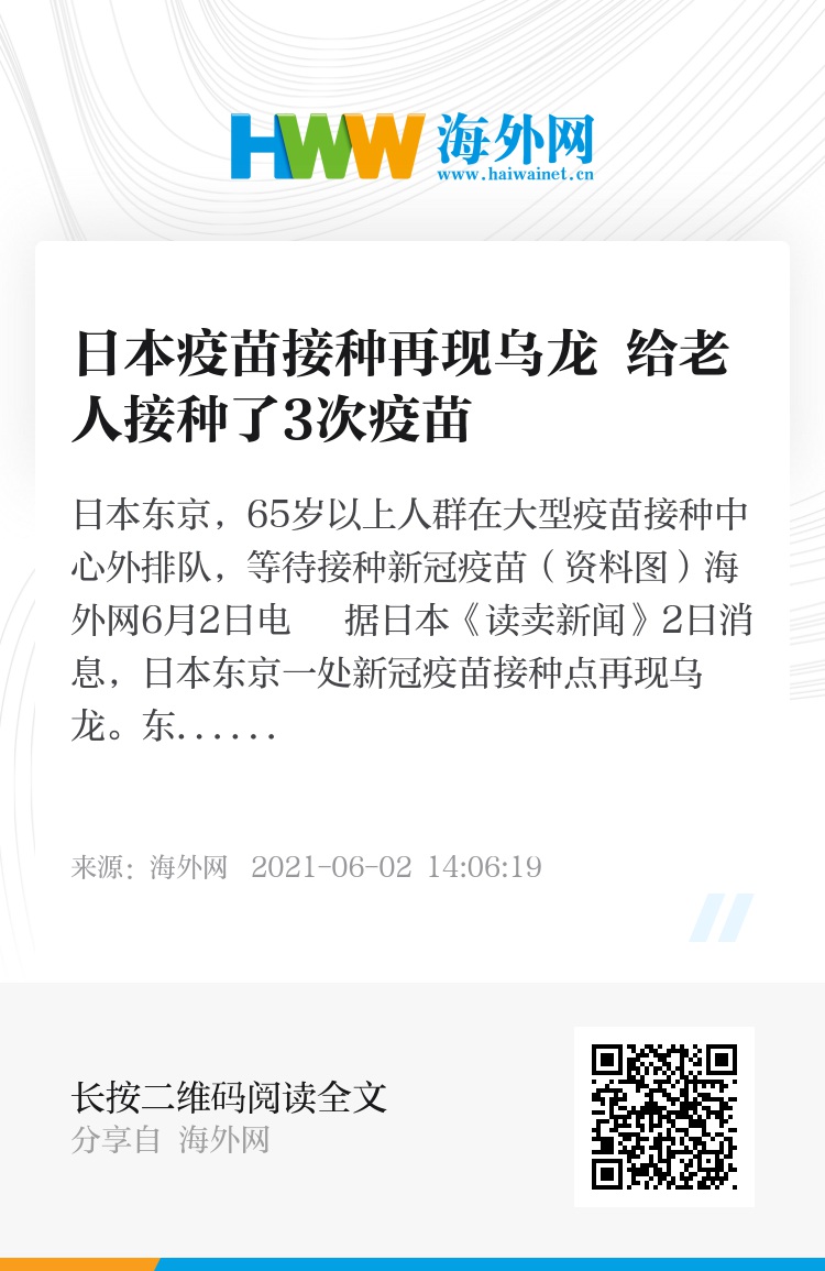 海外网6月2日电 据日本《读卖新闻》2日消息,日本东京一处新冠疫苗接种点再现乌龙。东京狛江市1日宣布,在市内一家老年人机构住宿的80岁老人误被注射了3次新冠疫苗。截至1日,这名老人身体未出现状况。