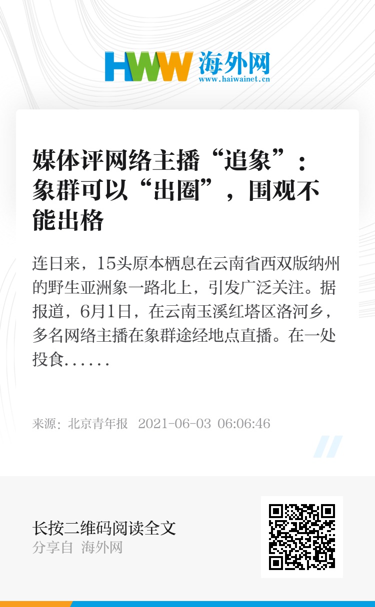象群可以“出圈”,但是围观不能出格。在“全民观象”的过程中,应尽最大可能与象群和谐共处,不伤害不打扰象群,让大象尽快平安“回家”。反之,为了流量及其背后的利益,一些主播不择手段追象,置生命健康和公共安全于不顾,这种自私行为应受到谴责和惩罚。