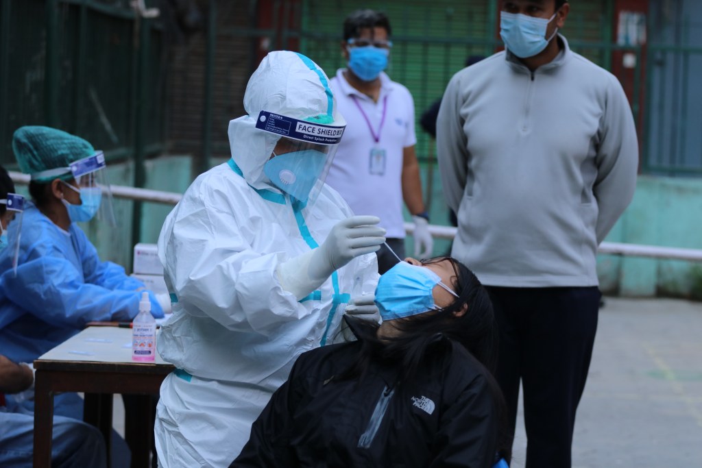 尼泊尔加德满都,民众进行新冠病毒检测。图片来源:澎湃影像