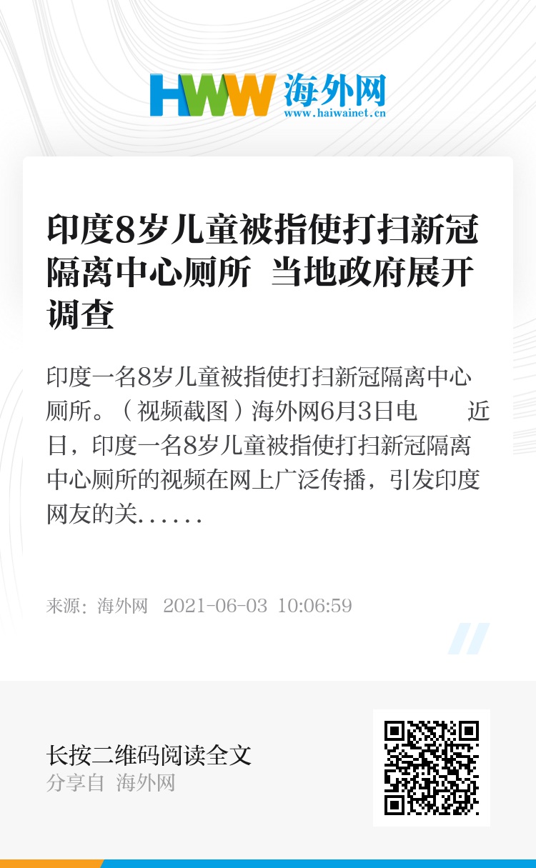 海外网6月3日电 近日,印度一名8岁儿童被指使打扫新冠隔离中心厕所的视频在网上广泛传播,引发印度网友的关注。当地政府已对此事展开调查。