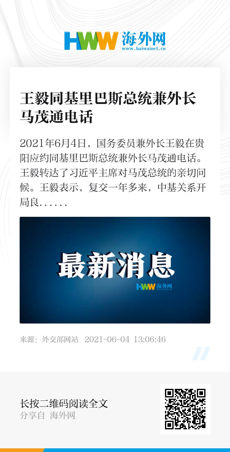 2021年6月4日,国务委员兼外长王毅在贵阳应约同基里巴斯总统兼外长马茂通电话。