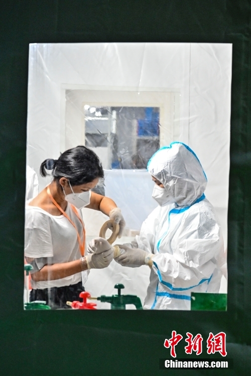6月3日晚,广东省广州市广州体育馆,由广州实验室联合国家呼吸医学中心、广州呼研院、金域医学等单位联合共建的四组“猎鹰号”气膜实验室全部启用,四组“猎鹰号”气膜实验室日核酸样本检测产能可达12万管。图为工作人员在“猎鹰号”气膜实验室内穿戴防护服。 中新社记者 陈骥旻 摄
