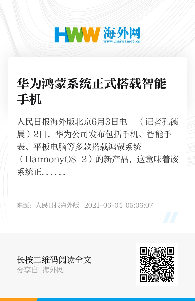 人民日报海外版北京6月3日电 (记者孔德晨)2日,华为公司发布包括手机、智能手表、平板电脑等多款搭载鸿蒙系统(HarmonyOS 2)的新产品,这意味着该系统正式搭载智能手机,同时也将打通电脑、电视、智能网联汽车、智能穿戴等终端设备,成为面向市场的正式产品。