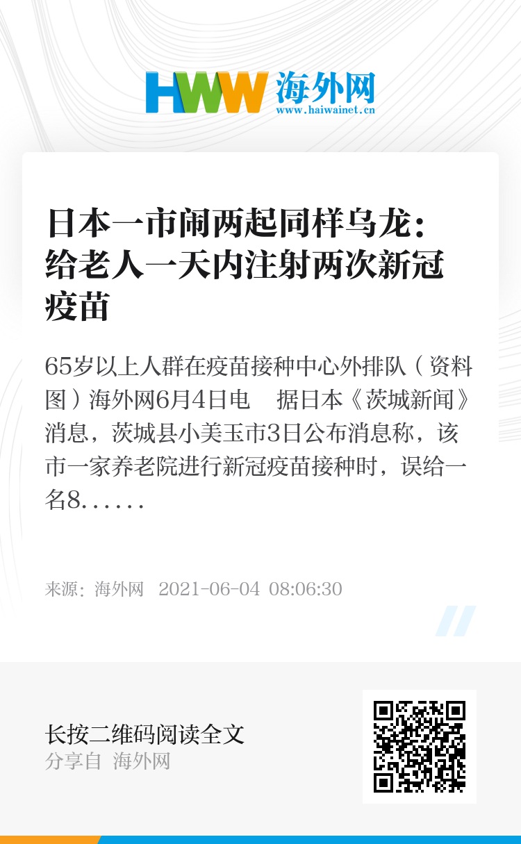 海外网6月4日电 据日本《茨城新闻》消息,茨城县小美玉市3日公布消息称,该市一家养老院进行新冠疫苗接种时,误给一名80岁入住者在同一天内注射了2次疫苗。这起乌龙原因是负责老人的护士以为第一次接种用的注射器是使用过的,又重新打了一次。目前老人身体暂无异状。