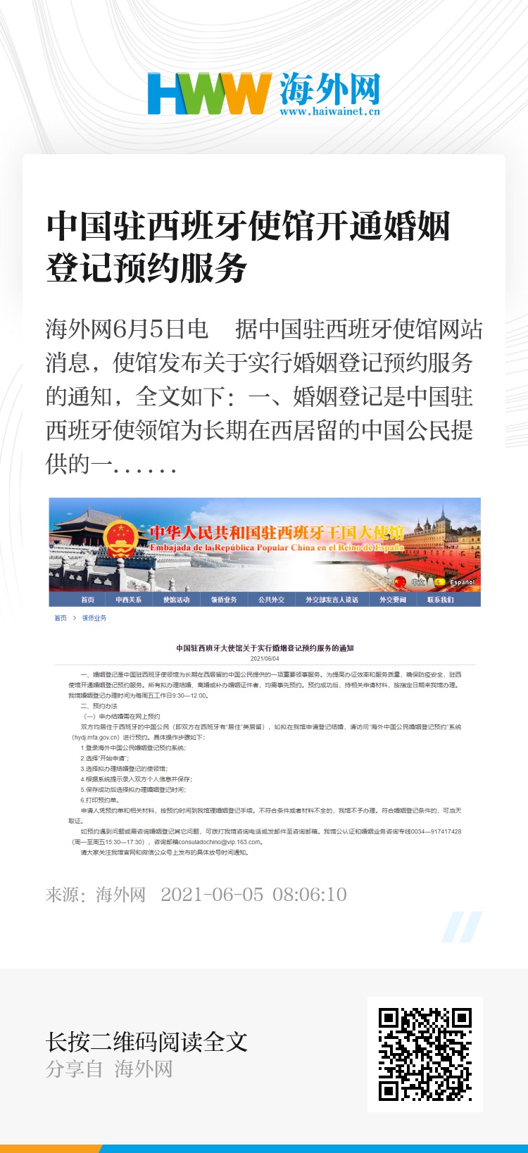 海外网6月5日电 据中国驻西班牙使馆网站消息,使馆发布关于实行婚姻登记预约服务的通知,全文如下: