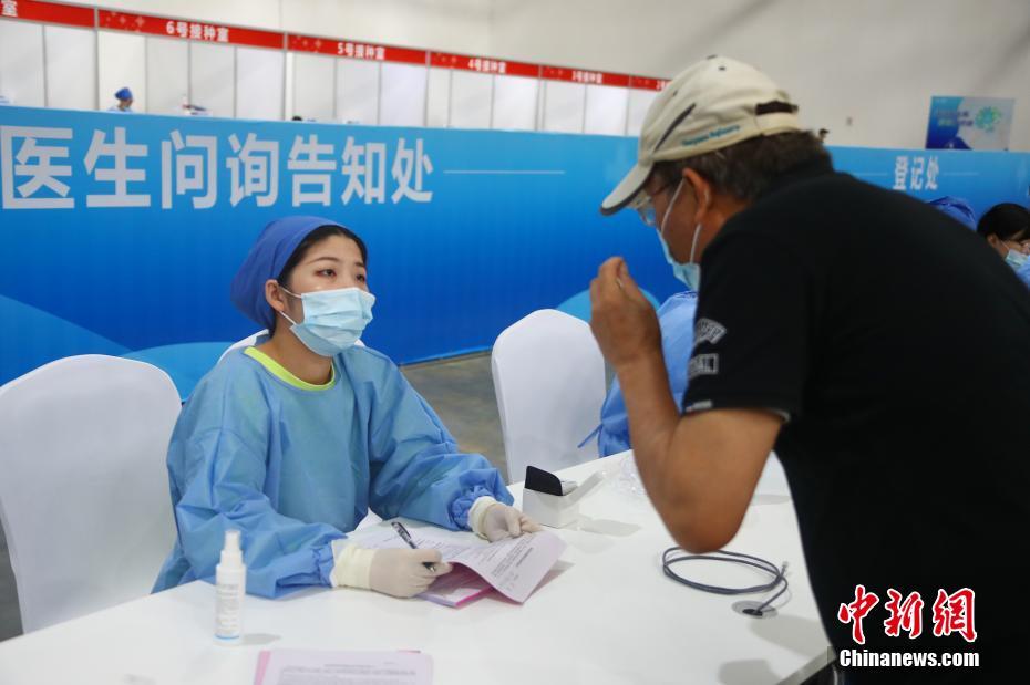 6月4日,江西南昌,一名医护人员告知台胞接种新冠疫苗注意事项。当天上午,南昌市台办集中组织自愿报名接种疫苗的70多名台湾同胞,在位于南昌市红谷滩区的方舱式疫苗接种点,接种新冠疫苗。 中新社记者 刘占昆 摄