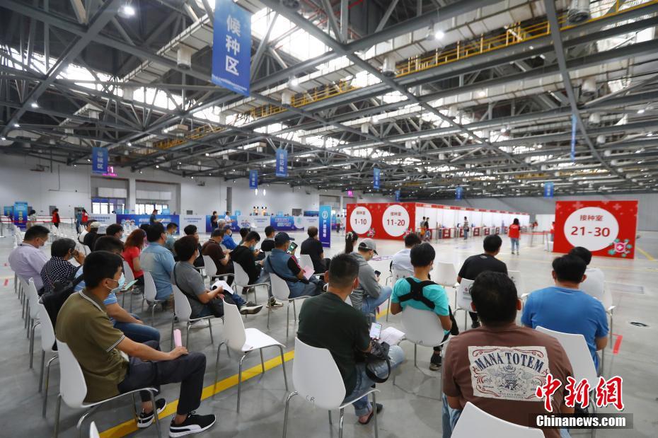 6月4日,江西南昌,台胞等待接种新冠疫苗。当天上午,南昌市台办集中组织自愿报名接种疫苗的70多名台湾同胞,在位于南昌市红谷滩区的方舱式疫苗接种点,接种新冠疫苗。 中新社记者 刘占昆 摄