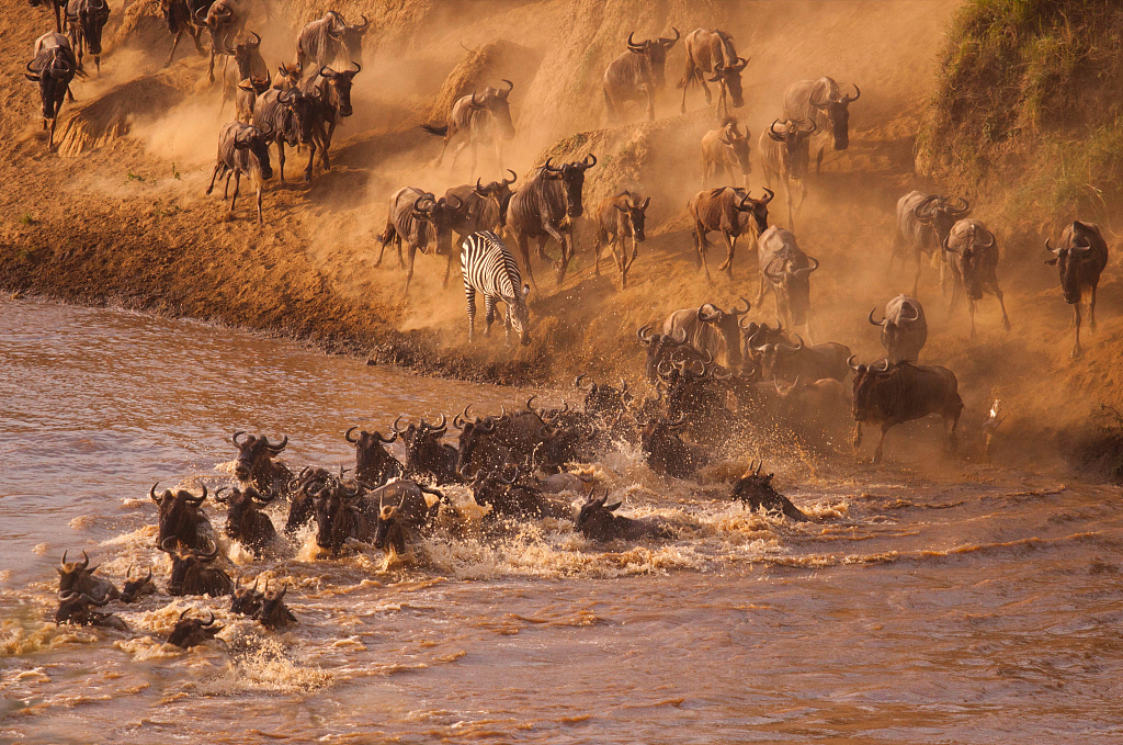 一群斑马加入角马队伍,穿越河流。它们每年4月开启大迁徙,超过200万斑马、瞪羚和角马在11月开始1800英里的往返旅程。图片来源:视觉中国