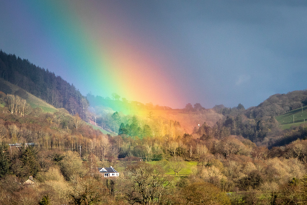 英国威尔士,威尔士中部特雷菲格利斯一处恬静的村庄出现了一道如同梦幻般的彩虹。图片来源:视觉中国