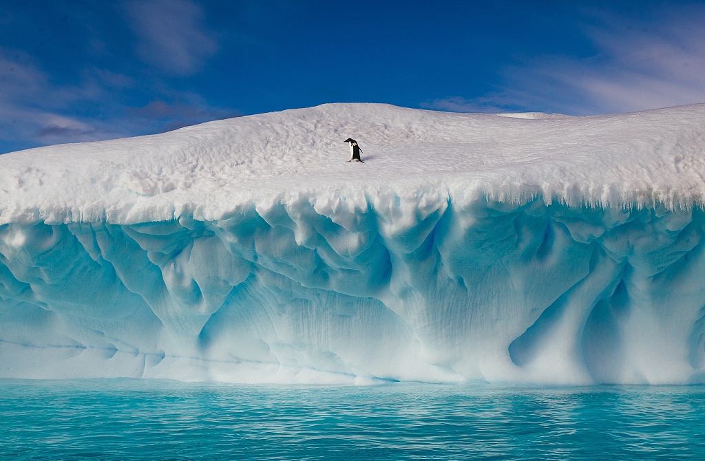 南极布朗断崖,一只在巨大冰山旁徘徊寻找同类的企鹅,看起来仿佛全世界最孤单。这只阿德利企鹅跳上冰层,走到这座厚达20英尺冰山的顶部,在回到海水前稍作休息。经过南极半岛北端的布朗断崖时,乘坐充气艇的摄影师Dave Merron拍到了这只落单的企鹅。图片来源:视觉中国
