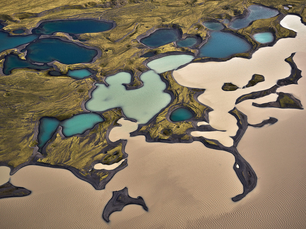 46岁的俄罗斯慈善工作人员 Stas Bartnikas用一架小型赛斯纳飞机拍了冰岛的风光图,宛若一幅色彩饱满的油画,图片中明亮的蓝色和绿色是融化的冰川。图片来源:视觉中国