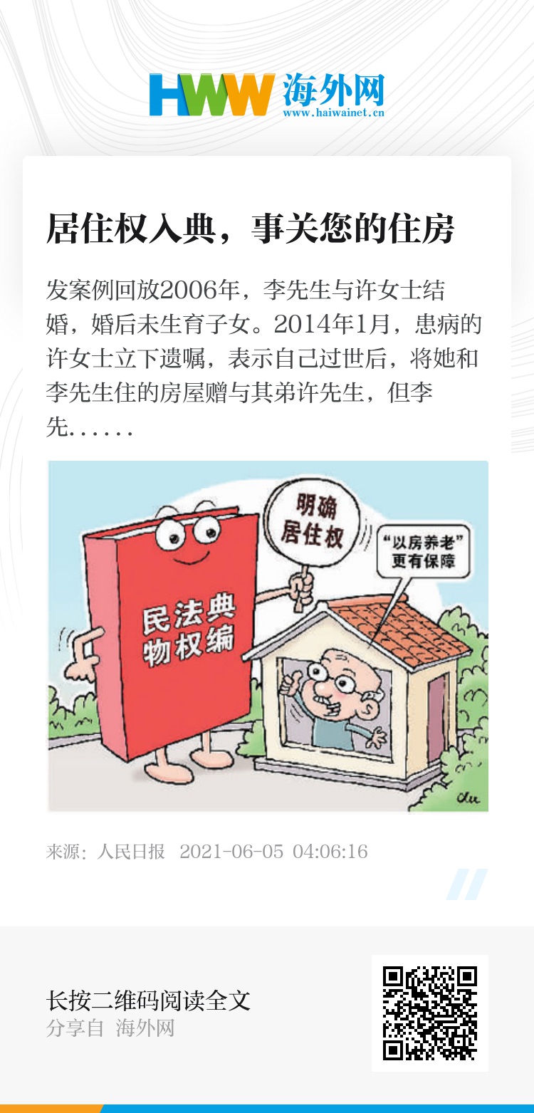 2016年11月,湖北省武汉市洪山区法院判决该房屋归许先生所有,李先生拥有该套房屋的居住使用权。法院判决后,李先生一直居住在该套房屋内,许先生未曾打扰。2021年初,李先生发现自己住的这套房子被妻弟许先生挂在某网络平台出售,担心房子被卖了以后影响自己继续居住,他持《判决书》来到洪山区法院执行局,申请居住权强制执行。法院于2月26日作出执行裁定,将该房屋的居住权登记在李先生名下。据悉,这是《民法典》颁布实施后,武汉首例居住权执行案件。