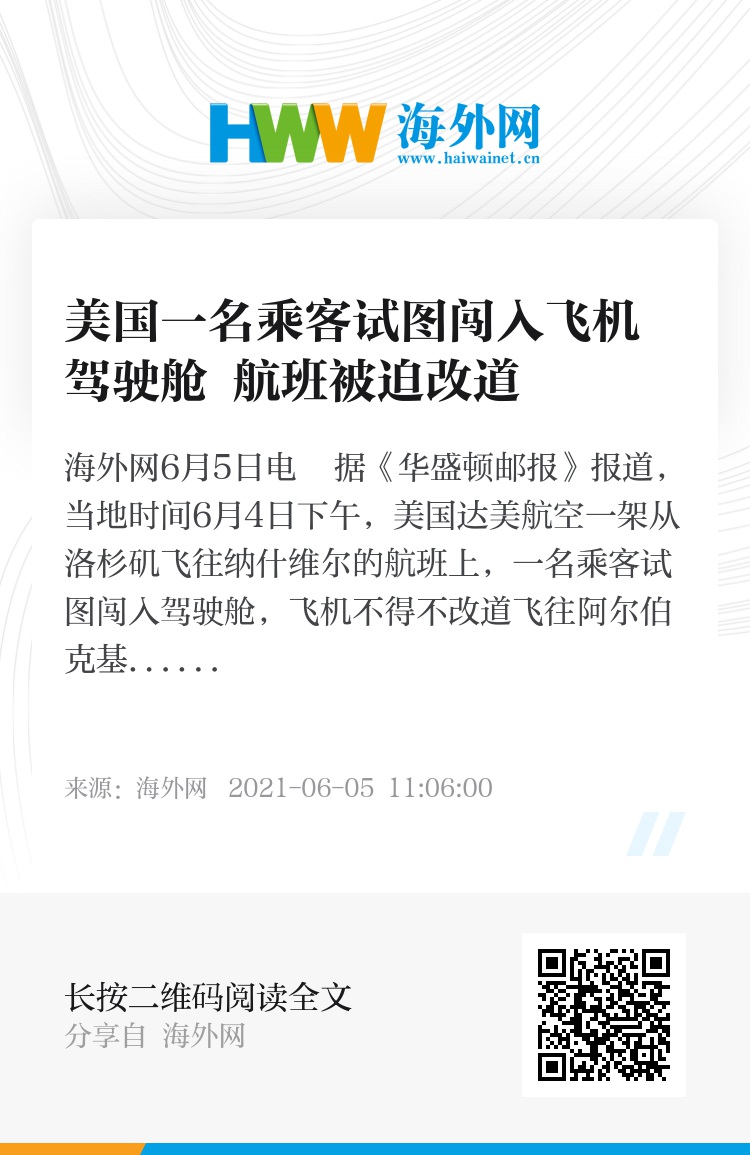 海外网6月5日电 据《华盛顿邮报》报道,当地时间6月4日下午,美国达美航空一架从洛杉矶飞往纳什维尔的航班上,一名乘客试图闯入驾驶舱,飞机不得不改道飞往阿尔伯克基。