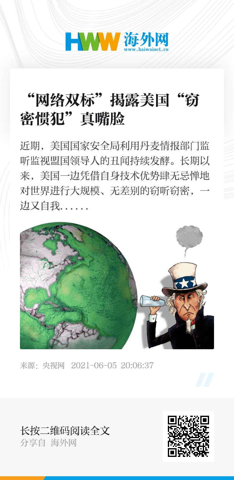 近期,美国国家安全局利用丹麦情报部门监听监视盟国领导人的丑闻持续发酵。长期以来,美国一边凭借自身技术优势肆无忌惮地对世界进行大规模、无差别的窃听窃密,一边又自我标榜为“网络安全卫士”,在网络安全领域屡屡对其他国家抹黑攻击,充分暴露了美国的虚伪面目和霸权本质。