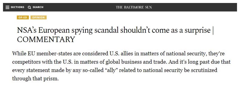 △《巴尔的摩太阳报》发表的题为《不应对美国国家安全局监视欧洲感到惊讶》的评论文章截图