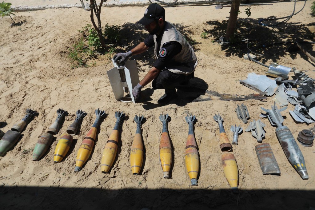 当地时间2021年6月4日,加沙,当地遭以色列空袭后,拆弹小组清理出约1200枚导弹和炮弹。图源:澎湃影像