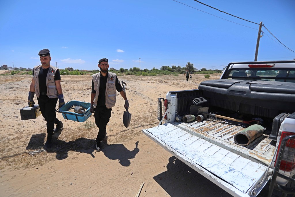 当地时间2021年6月4日,加沙,当地遭以色列空袭后,拆弹小组清理出约1200枚导弹和炮弹。图源:澎湃影像