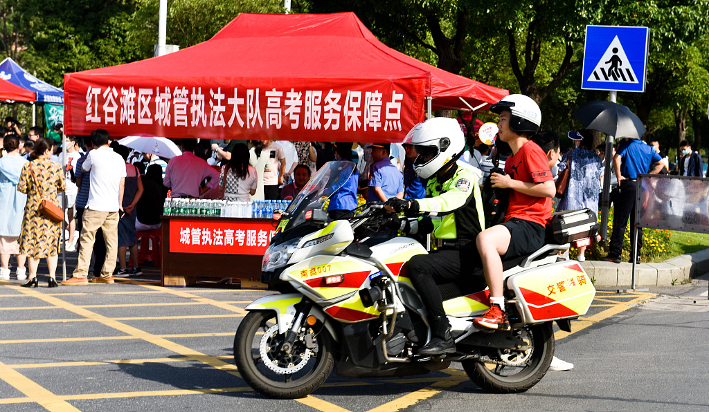 6月7日,2021年全国高考启幕,南昌市公安局为高考护航,交警骑摩托车护送走错考场或堵在车上的考生。图片来源:人民视觉